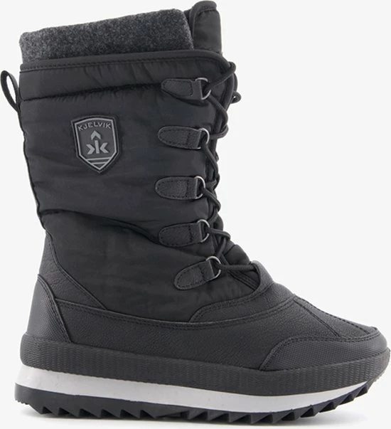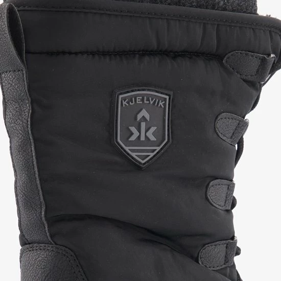 Zwarte dames snowboots van Kjelvik. Gemaakt van synthetisch leer en textiel, een binnenwerk van textiel en een stevige profielzool van rubber. De snowboots hebben een vetersluiting en een warme voering. Op deze manier blijven kou en sneeuw buiten en blijven de voeten lekker warm. De snowboots hebben een vast votbed. Het bovenwerk is voorzien van een Kjelvik merklogo. De dikke, rubberen buitenzool biedt goede grip tijdens het lopen, ook op gladde ondergronden.